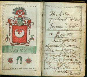 (In Rot ein weißes »Schroetereisen«; andere Deutung: In Rot ein dreipaßförmig ausgeschlagenes weißes Seeblatt). Helmzier: rotes Schildbrett mit Schroetereisen. Hinter dem Schild eine Kordel, die die Buchstaben J und S umschlungen hält, darunter grünes Schriftband mit Cum Deo; darunter ein grünes Tor, rechts und links begleitet von zwei roten Rosen (für »Rosport« = »Rosentor«); handschriftlicher Eintrag: Hic liber pertinet ad me/ Joannis Schroeder/ ex Rosport/ den 21. aprilis 1788. Dann, andere Handschrift: Joannis Schroeder, Pater suus: Joannes Schroeder ex Rosport: Georgius Müller, Parochus in Mesenich. Als Frontispiz in: Das Herz zu Gott oder Andachts= und Tugends= Uebungen von Pater Laurentius Campill. Saardillingen, gedruckt bey Michael Leistenschneider, 1769.