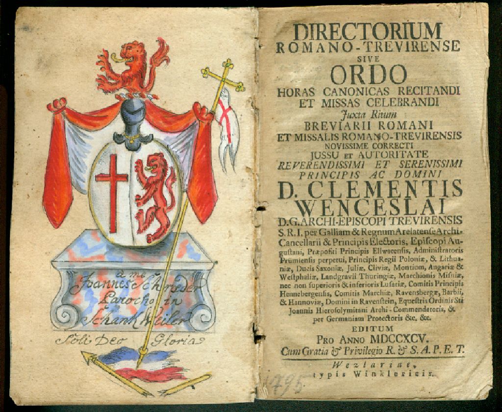 »Directorium Romano-Trevirense…« Richtlinien für die Liturgie des Tages im Erzstift Trier durch den letzten Erzbischof von Trier, Kurfürst Clemens Wenceslaus, für das Jahr 1795 [MDCCXCV]. Neben dem Wappen „ersticht“ das Christusbanner die französische Trikolore.
