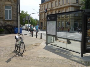 Dies Foto entstand zwar bei der Gelegenheit wo ich die Elefanten fotographierte, die Aussage ist aber eine andere. Die futuristische “alte” Bushaltestelle ist vor kurzem erneuert worden. Dabei wurden (vorläufig?) die Fahrradständer abgeschafft. Ich behalf mich mit der übrig gebliebenen Stange die eigentlich darauf hinweist, dass hier ein Fahrradständer sei, und kettete mein Fahrrad an diese. Der Ständer war zuvor hier an einer durchaus angebrachten Stelle: Viele Staatsbedienstete kommen mit dem Rad zur Kantine.
