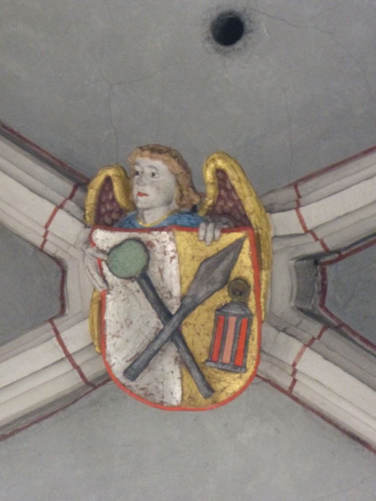 Das Rohr mit dem Essigschwamm, die Lanze, die Jesu Seite öffnet, sodass Blut und Wasser heraus läuft; eine Lampe…