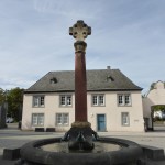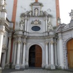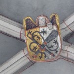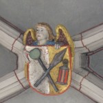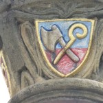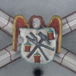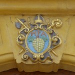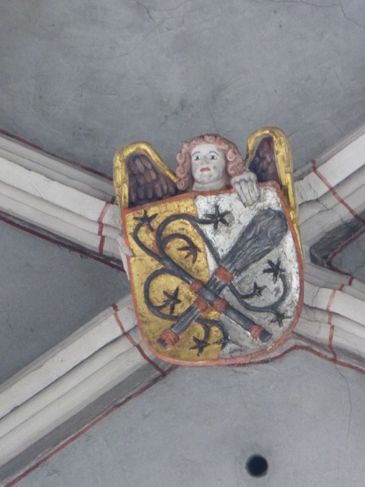 Andachtswappen: Die Geißelwerkzeuge, eine Rute und eine Geißel (mit spitzen Eisensternen an den Seilenden), mit denen Jesus nach dem Verhör durch Pilatus gefoltert wird… Der von Gold und Silber gespaltene Schild führt damit die höchsten kirchlichen Farben.