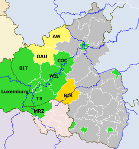 Im Rahmen des Projektes “Gemeindewappen” hatte ich Mitte 2014 angefangen mit den deutschen Grenzgemeinden, und arbeitete mich nach und nach durch die angrenzenden Landkreise, Priorität auf die an Luxemburg angrenzenden Gemeinden. Priorität gab ich ansonsten auch Rheinland-Pfalz, dem Bundesland in dem ich lebe. Die folgende Karte gibt wieder, welche Zeichnungen schon erstellt sind: