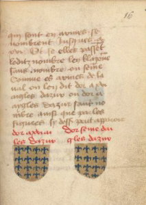 Quant à sa date, elle ne peut pas remonter plus haut que l’année 1416. Car, dans la seconde partie de l’opuscule, nous voulons parler du petit armorial, on trouve ceci, à l’article du duc de Berri: « Est de l’apanage de la couronne de présent, et n’est plus du compte ne nombre du Vergier de France. » Or, il s’agit ici de Jean, duc de Berri, mort en 14165, et dont l’apanage fit alors retour à la couronne. Cela dit sur le contenu et l’âge de notre manuscrit, passons à sa valeur. Il faut bien qu’elle eut paru grande dans son temps, car il existe, rien qu’à la Bibliothèque impériale, sept manuscrits qui contiennent la reproduction intégrale de ce petit traité de blason en douze chapitres, soit seul, soit entremêlé à d’autres traités.