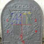 Figure 2. Voici un autre exemple des armes de l’Espagne, mais à une époque plus tard. Certains éléments comme la tour de Castille, le lion de Léon et les armoiries d’Aragon-Sicile sont bien visible dans la partie supérieur de l’écu. Cette taque se trouve sur le mur extérieur du château de Rettel (F).