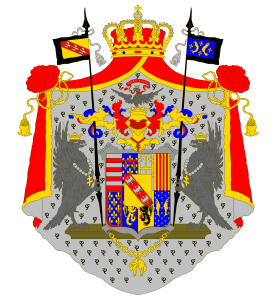 Le tout sous un pavillon royal aux couleurs de Lorraine, frangé et houppe de même, fourré d’hermine, et comblé de la couronne royale de Jérusalem.