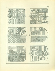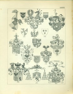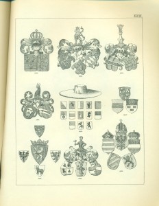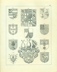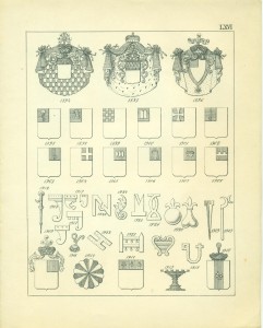 Bei Möbeln und Gerätschaften ist der Gebrauch der Wappen als Eigentumsbezeichnung besonders dankbar, da diese bei richtiger Anwendung immer zur Verschönerung und Verzierung des Hauptgegenstandes dienen . Die Mannigfaltigkeit der Anwendung in diesem Falle ist so groß, dass, wollte ich für alle vorkommenden Fälle historische Beispiele geben, ich einen Katalog des hiesigen Nationalmuseums, beziehungsweise der darin aufbewahrten Gegenstände dieser Art, wollte ich es nur für die Gegenwart tun, die Beschreitung eines adeligen Hauses von heutzutage hier unternehmen müsste. Vom Schlossblatte am Haustor bis zur Wetterfahne auf dem Dache ist nichts, was nicht schon durch die Heraldik verziert oder gekennzeichnet worden wäre. Die Wartbänke in den Vorplätzen, die Podeste der Treppenhäuser, die Schränke, Stühle, Bettstellen, Oefen und Oefenschirme, Sofa’s, Kissen, die Tische, Wandkässchen, Fenster, die Wände (Tapeten) und Zimmer decken (Plafonds), die Kronleuchter etc., sind ebenso wohl Gegenstände heraldischer Verzierung, als die Gläser, Krüge, Teller, Messer, Briefbeschwerer, Vasen, die Albums, Portefeuilles, Mappen, Taschen, Wetschger, Stöcke, Briefbogen, Tintenzeuge und Visitenkarten, die Schmuckgegenstände, Gürtel, Pantoffel und Hausschuhe, Teppiche, Tabakspfeifen, Tabaksbeutel, Zigarrentaschen und -Spitzen, — die Küchengeräte, Marzipan- und Tortenmodel, Hollippencisen usw. usw.