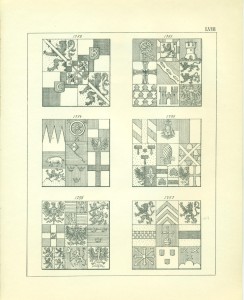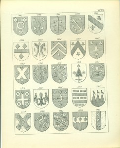 Wir finden daher sehr selten ein Beispiel der Blasonierung eines vollkommenen Wappens mit Schild, Helm, Kleinod und Decken in den Urkunden und Büchern jener Länder, ohne dass dort dieser Mangel empfunden worden wäre oder würde, denn zu allen Zeiten findet man das Kapitel von den Kleinoden in den Lehrbüchern der Engländer und Franzosen sehr oberflächlich und nebenbei behandelt, wenn nicht gar ausgelassen, da bestimmte Regeln hierüber sich nicht gebildet haben, weil sie nie notwendig erachtet wurden. Was nun die heraldischen Benennungen (Kunstwörter) betrifft, so besitzen die französische und englische Heraldik eine große Menge, von denen jedoch nach unserem Standpunkt ein guter Teil, wenn nicht überflüssig, doch zum mindesten entbehrlich ist. Die ältesten Wappen sind, wie in anderen Ländern, so auch in Frankreich und England, sehr einfach, daher auch ihre Blasonierung weniger Worte bedarf. Als Beispiele gebe ich einige Blasonierungen aus dem erwähnten Armorial de France: