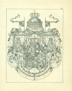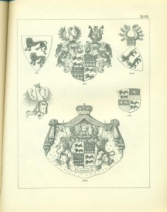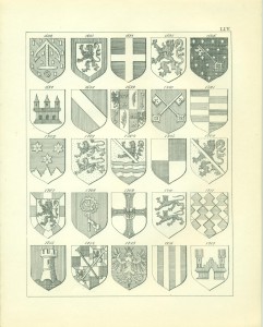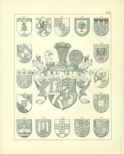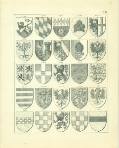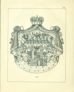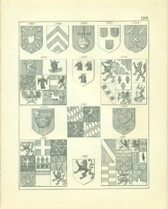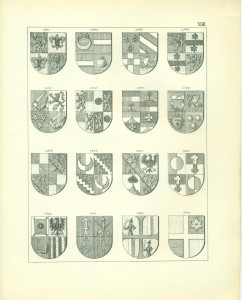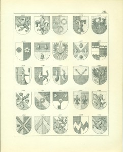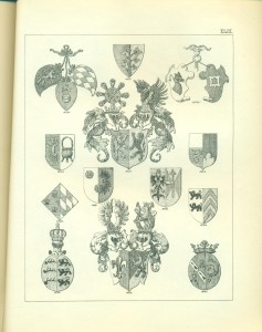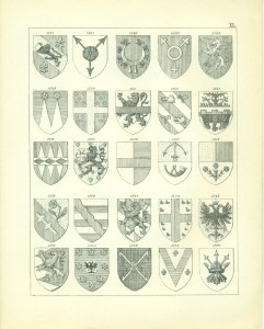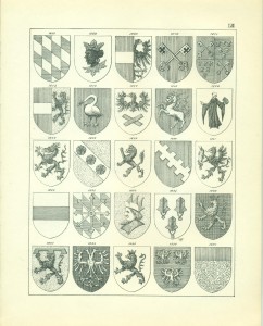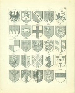 Endlich erwähne ich hier noch sachgemäß der Waffen als Gegenstände, auf welchen Wappen in früheren Zeiten sehr häufig angebracht wurden, insbesondere auf Schilden und Helmen, so dass, wie bekannt, die Wappen ihren Namen von den Waffen erhalten haben, Wappenschilde auf dem Kreuze der Schwertgriffe kommen namentlich bei Prachtschwerten sehr häufig vor, ebenso Wappen auf Köchern, Brustharnischen, Helleparten etc. Heutzutage dürfte das Anbringen von Wappen auf Geschützen vielleicht noch die einzige mehr gangbare heraldische Übung bei Trutz- ober Angriffswaffen, die Anwendung der Wappen auf den Helmen, Tschako’s etc. der Armee die bemerkenswerteste für die Schutzwaffen sein.