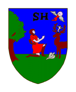Une image de Saint Hubert vêtu en chasseur de gueules botté et éperonné au naturel ayant son cor pendu à un cordon passé à son col ayant un genou en terre devant un cerf au naturel mouvant du flanc senestre ayant au milieu de son bois un crucifix dont la croix est de sable et le christ de carnation le chapeau de St. Hubert posé à terre entre les deux accompagné au canton senestre du chef d’une tête d’ange de carnation aux ailes d’argent ayant à son cou une étole de gueules. Du flanc dextre de l’écu mouvant un demi arbre au naturel et au milieu du chef sont deux lettres S.H. de sable le tout dans un paysage au naturel