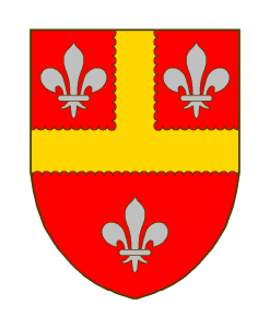 De gueules au pal engrêlé d’or, retrait en chef, soutenu d’une fasce engrêlée du même, le tout accompagné de trois fleurs-de-lis d’argent, dont deux accostant le pal et la troisième en pointe.