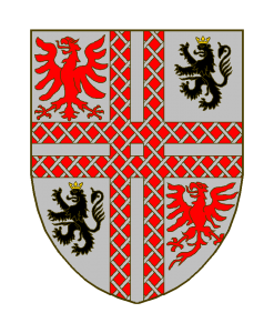D’argent à deux jumelles de sable, frettées de premier émail, passées en croix, accompagnées aux 1 et 4 d’une aigle de gueules et aux 2 et 3 d’un lion de sable,couronné d’or.
