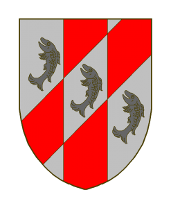 Losangé d’argent et de gueules, au moyen d’un tiercé pal et d’un tiercé en barre, la première losange d’argent, les trois losanges d’argent, qui se suivent dans les sens d’une bande, chargées chacune d’un poisson au naturel, posé en pal et courbé vers senestre.