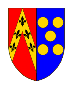 Parti au I de gueules au chevron d’or chargé de cinq fleurs de lis de sable posées dans le sens du chevron, au II d’azur à cinq besants d’or.