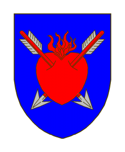 D’azur au coeur humain enflammé de gueules, percé de deux flèches de gueules, armées d’argent, les pointes en bas, passées en sautoir.