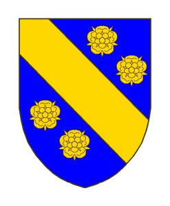 D’azur à la bande d’or, accostée de quatre roses du même, deux en chef, deux en pointe.