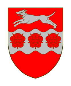 De gueules à la fasce ondée d’argent chargé de trois roses de gueules, accompagnée en chef d’un lévrier courant d’argent.