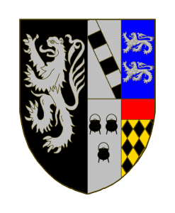 Parti, au I de sable au lion d’argent, lampassé de gueules, au II écartelé au 1er d’argent à la bande componée d’or et de sable de six pièces, au 2e d’azur à deux léopards d’argent l’un sur l’autre, au 3e d’argent à trois chaudières de sable remplies d’or fretté de sable, au chef de gueules.
