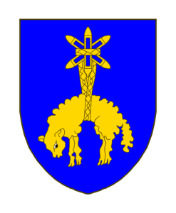 [D’azur à trois navettes de tisserand, deux en sautoir, la troisieme brochant en pal sur les deux autres, auxquelles est suspendue par une chain tissée, une toison, le tout d’or.]