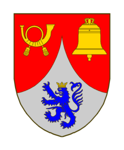 D’argent au lion d’azur couronné d’or, mantelé ployé de gueules chargé à dextre d’un cor de poste et à senestre d’une cloche, le tout d’or.