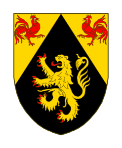 De sable au lion d’or armé et lampassé de gueules; chapé d’or à deux coqs hardis de gueules, celui de dextre contourné: