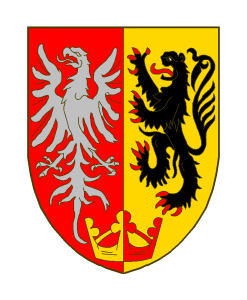 Parti de gueules et d’or, chargé en pointe d’une couronne de l’un en l’autre. Au I une aigle d’argent, au II un lion de sable, armé et lampassé de gueules.