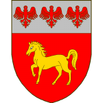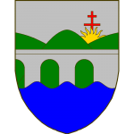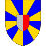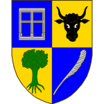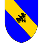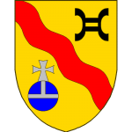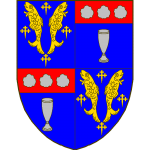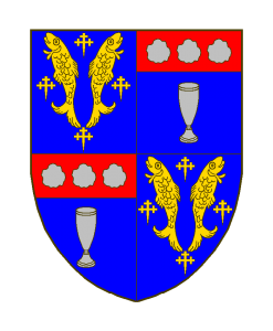 Écartelé, au premier et au quatrième d’azur aux deux bars adossés d’or accompagnés de quatre croisettes recroisetées au pied fiché du même, au deuxième et au troisième d’azur à la coupe d’argent au chef cousu de gueules chargé de trois cailloux d’argent.