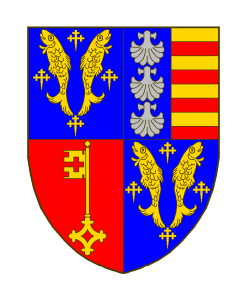 Écartelé: au premier et au quatrième d’azur aux deux bars adossés d’or, accompagnés de quatre croisettes recroisetées au pied fiché du même, au deuxième parti au I d’azur aux trois coquilles d’argent rangées en pal et au II fascé d’or et de gueules de huit pièces, au troisième de gueules à la clef d’or en pal.