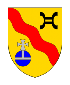 D’or à la bande ondée de gueules, accompagnée en chef d’une anille de sable et en pointe d’un monde d’azur ceintré et croiseté d’argent.