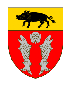 De gueules aux deux saumons d’argent, accompagnés en chef d’une rose du même, au chef d’or chargé d’un sanglier de sable défendu aussi d’argent.