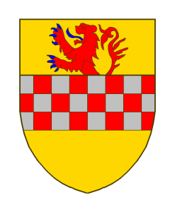 D’or à la fasce échiquetée d’argent et de gueules, brisé d’un lion de gueules, armé et lampassé d’azur, issant de la fasce.