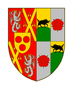 Parti: au I écartelé: aux 1 et 4 de gueules au lion d’argent, armé, lampassé et couronné d’or, celui du I contourné, aux 2 et 3 de gueules au sautoir d’or, cantonné de 4 forces du même, les bouts en bas, et sur le tout d’or à trois tourteaux de gueules. Au II écartelé: aux 1 et 4 d’or au sanglier arrêté de sable, posé sur une terrasse de sinople, celui du 1 contourné, aux 2 et 3 d’argent à la rose de gueules.