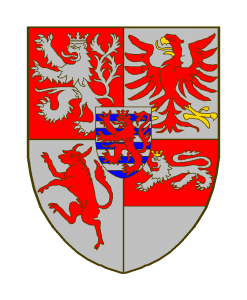 Écartelé : au I de gueules au lion d’argent, armé, lampassé et couronné d’or, la queue fourchue et passée en sautoir qui est de Bohême, au II d’argent à l’aigle de gueules, membrée, becquée et liée d’or, qui est de Brandebourg, au III d’argent au boeuf rampant de gueules qui est de Lusace, au IV coupé de gueules au lion passant d’argent couronné d’or, et d’argent, qui est de Goerlitz. Sur le tout de Luxembourg.