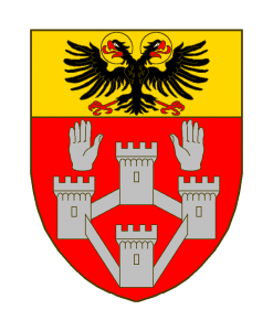 De gueules au château à quatre tours d’argent (ou plutôt enceinte â quatre tours ) surmonté de deux mains appaumées du même, l’une à dextre, l’autre à sénestre, au chef du Saint-Empire (d’or à l’aigle bicéphale de sable, nimbé e).