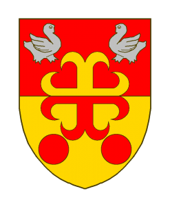 Coupé de gueules et d’or, à la croix ancrée de l’un en l’autre, cantonnée en chef de deux merlettes affrontées d’argent, en pointe de deux tourteaux de gueules