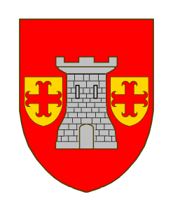 De gueules à la tour d’argent maçonnée de sable, accostée de deux écussons d’or à la croix ancrée de gueules