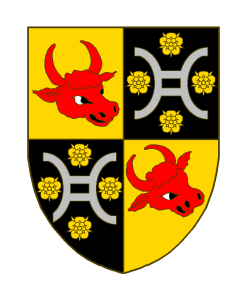 Écartelé: au 1 et 4 d’or à une tête de boeuf contournée de gueules au 2 et 3 de sable à l’anille d’argent cantonnée de 4 roses d’or.