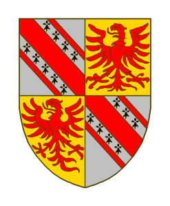 Écartelé, aux 1 et 4 d’argent à la bande coticée de gueules, les entre-deux parsemés d’hermine, aux 2 et 3 d’or à l’aigle de gueules.