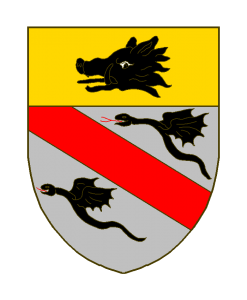 D’argent à une bande de gueules, accompagnée de deux serpents ailés ou amphistères de sable, lampassés de gueules, au chef d’or chargé d’une hure de sanglier de sable.