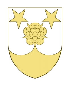 Une rose en abîme accompagnée en chef de deux étoiles à cinq rais renversées, la pointe chapée-ployée.