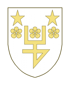 Un meuble en forme de fourche à deux dents posées en pal abaissé, surmonté de deux étoiles (5) accompagné de trois roses posées en fasce, celle du milieu entre les deux branches de la «fourche» la tige de celle-ci formant un chiffre 4 renversé.