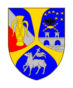 Tiercé en pairle patté d’or renversé, à dextre tiercé en bande d’azur, d’argent et de gueules, au gerbillon d’or, lié et enrubanné de même, à sénestre d’azur au pont de trois arches d’argent supportant deux tours et mouvant d’une rivière de même, surmonté d’une aigle de sable empiétant un foudre d’or en fasce,