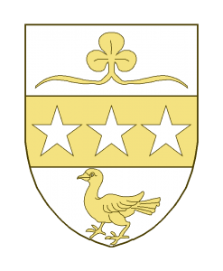 Une fasce chargé de trois étoiles, surmontée d’un trèfle à deux racines, et accompagnée en pointe d’un oiseau.