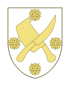 Un couteau et un couperet de boucher en sautoir, cantonnés de quatre roses.