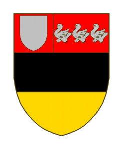 Coupé de gueules et d’or, à la fasce de sable brochant, surmontée de trois merlettes rangées d’argent, au franc-canton dextre cousu de gueules à l’écusson d’argent.