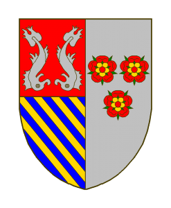 Parti, au I coupé: a) de gueules à deux dauphins accostés d’argent posés en pal, les têtes en bas et affrontées ; b) d’azur.à cinq cotices d’or. Au II d’argent à trois roses de gueules boutonnées d’or, barbées de sinople.