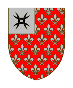 De gueules semé de fleurs de lis d’argent, au canton d’argent à une anille alternée, (meuble spécial), de sable.