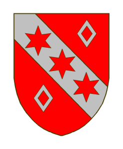 De gueules à une bande d’or chargé de trois étoiles à six rais de gueules, accompagnée de deux mâcles d’argent.