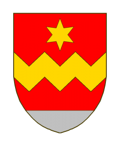 De gueules à la fasce vivrée de deux pointes d’or accompagnée en chef d’une étoile à six rais du même à la champagne d’argent