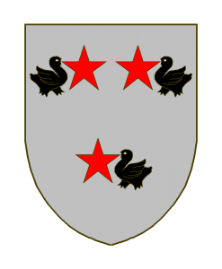 D’argent à trois merlettes de sable, les deux du chef affrontées, toutes tenant au bec une étoile de gueules