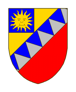 Taillé d’or et d’azur, à la barre emmanchée d’argent et d’azur brochant, au franc-quartier (D’azur?) au soleil rayonnant.